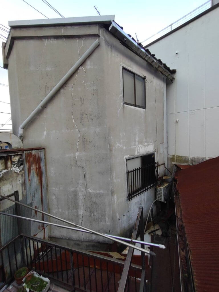 外壁にひびが入って軒天のモルタルはお隣の敷地に落ちていました。